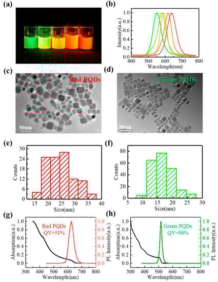 The (a) solution and (b) emission lines of different color PQDs. TEM image of (c) red and (d) green PQDs. Particle size distribution of (e) red and (f) green PQDs. Spectral curves of (g) red and (h) green PQDs.