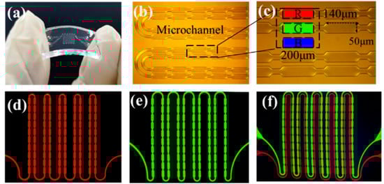 (a) Image of a physical flexible chip bending. (b) Flexible chip microchannels and (c) partially enlarged view of microchannels. (d) Red pixel array, (e) green pixel array, and (f) two-color pixel array.