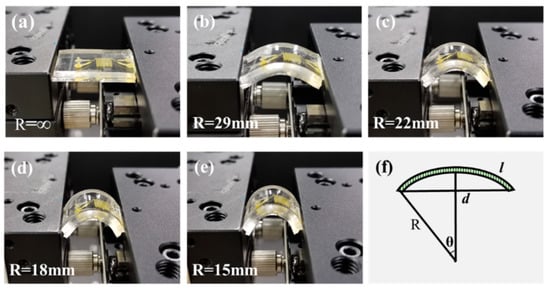 To verify the reliability of the FQCL chips, their bending-state performance was tested. The FQCL was fixed with a precision displacement platform and bent under different curvature radii, as shown in Figure 5. The length (l) of the FQCL was fixed. The bending radii (R) of the FQCL were infinity, 29, 22, 18, and 15 mm, respectively. During the experiment, the corresponding radius was achieved by adjusting the chord length (d). According to the chord length formula and the trigonometric function formula, the relationship between d, l, and R is expressed by Equation (1), as shown in Figure 5f.