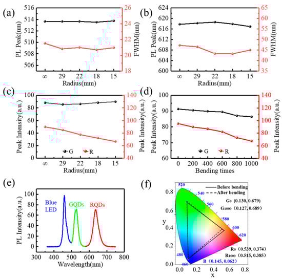 Under the excitation of a 460 nm blue LED, spectrometers (Ocean Optics USB2000+, Ocean Insight, Rochester, NY, USA) were used to test the PL spectra of the red and green FQCL subpixels, fixed on different columns, with bending radii of infinity, 29, 22, 18, and 15 mm. Figure 6a,b show the emission peak and FWHM curves of the green and red FQCLs under different bending radii, respectively. As the bending radius of the chip decreases, the emission peak of the green FQCL fluctuated around 514 nm, with a variation range of less than 0.05%, and the FWHM fluctuated around 21 nm, with a variation range of less than 2.5%. The emission peak of the red FQCL fluctuated around 618.5 nm, and the variation range was less than 0.5%. The FWHM is about 45 nm, and the fluctuation range was less than 10%. As the bending radius fell, the naturalized relative peak intensity of the green FQCL emission spectrum was about 88, with a fluctuation range of less than 3%. The naturalized relative peak intensity of the red FQCL showed a gradual decline of about 26%, as shown in Figure 6c. Under different bending radii, the emission peak, FWHM, and peak intensity of the green FQCL emission spectrum were relatively stable. According to theory and experiments, we know that the shape of CsPbBr3 PQDs are cube, while that of CsPbI2Br PQDs are rectangle. Compared with CsPbBr3 PQDs, CsPbI2Br PQDs have a larger size and size range. Based on these findings, we inferred that when the bending radius increased, and under the action of stress, this change of the PQDs arrangement led to larger gaps between the PQDs, as well as a decrease in the absorption rate and conversion efficiency of the PQDs film. Compared with the green PQDs, the size and gaps of the red PQDs are larger, so the density of the film decreased more obviously in the bending state, and the detected emission intensity decreased significantly.