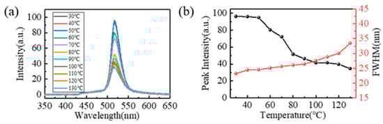 As the LED functions, part of the input electric energy is converted into heat through non-radiative recombination, which increases the temperature of the LED surface. However, the fluorescent intensity of the quantum dots decreases as the temperature increases. If the temperature does not change much, it can be controlled by the physical process of thermal activation, and this thermal-activation process is reversible. The FQCL chip made with microfluidics can disperse the heat generated by the LED. The luminescence of the FQCL was tested at 30–130 °C, as shown in Figure 7. The relative peak intensity of FQCL pixels at 70 °C exceeded 70% of the peak intensity at room temperature. For comparison, R-S Liu reported [] that the relative peak intensity of untreated CsPbBr3 dropped to 25% at 75 °C. This device shows obvious advantages in improving the thermal stability of PQDs.