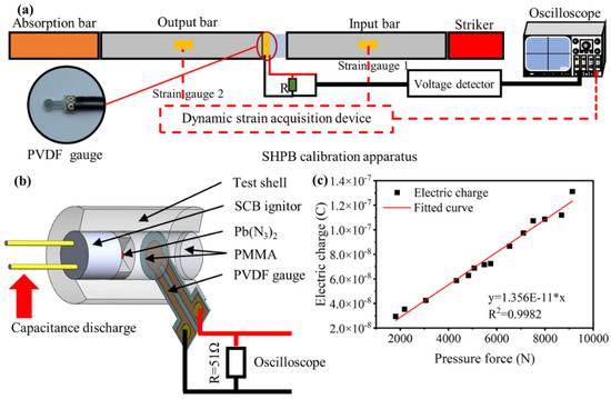 (a) Schematic diagram of SHPB calibration apparatus. (b) PVDF gauges test circuit. (c) Electric charge obtained by PVDF gauges as a function of pressure force generated by SHPB.
