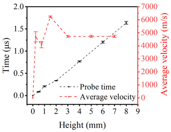 The average detonation velocities at the heights of 0.25, 0.75, 1.5, 3.0, 5.0, and 7.0 mm were calculated by Equations (1) and (2) and shown in Figure 5. The graph reveals that the average velocity has a sharp rise at the height of 0~1.5 mm, then reaches a peak of 6233 m/s at approximately 2.0 mm, and finally decays at a plateau of 4726 ± 8 m/s by 3.0 mm. In contrast to the results obtained in large pellets, a significant drop of velocity was observed in small charges. Another interesting aspect of this graph is the steady detonation velocity of LA with a diameter of 1.2 mm, measured—not calculated—which provides the basis for subsequent calculations. Hence, the detonation process of LA can be roughly described as follows. First, within the height of 3.0 mm, the detonation propagates unsteadily after ignition. Second, after 3.0 mm, the steady detonation has formed. However, the figure cannot provide the precise critical height between unsteady and steady detonation, due to the limitation of the probe size.