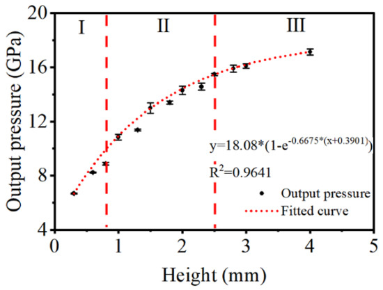 The figure below illustrates the main results of the intercorrelation between output pressure and charge height. The output pressure increases logarithmically with the height and is projected to remain steady at 17~18 GPa. Closer inspection of Figure 5 and Figure 6 show that both velocity and pressure share the same height of reaching stability at approximately 2.5~3.0 mm.