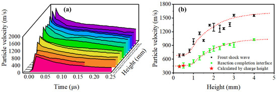 (a) Particle-velocity profiles at the heights of 0.3~4.0 mm. (b) Particle velocity of the shock front and reaction–completion interface as function of charge height.