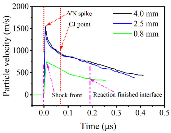 Figure 8 compares the particle-velocity profiles of 0.8 mm, 2.5 mm, and 4.0 mm. The particle-velocity profile at 0.8 mm does not have a VN spike and obvious reaction–completion interface, because the energy released in reactions is not enough to support a steady shock profile. The particle-velocity profiles at 2.5 mm and 4.0 mm have the same particle velocity of the VN spike and CJ point, which indicates that the detonation is stable at 2.5 mm.