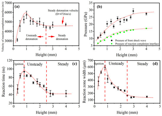 The pressure of the shock front was calculated based on the particle velocity of the front shock wave and the velocity of the reaction–completion interface which was corrected by local particle velocity, as shown in Figure 9b. The pressure of the shock front is much higher than the pressure of the reaction interface, as a result of the enhancement of chemical energy released in the reaction zone. In addition, the data of shock front pressure fluctuates more than the data of reaction interface pressure, which proves that the shock front is more susceptible to initial density of charges. Both pressure of the shock front and the reaction interface increase with height, and are expected to remain steady after 2.5 mm at 27.42 ± 1.02 GPa and 17.12 ± 0.22 GPa.