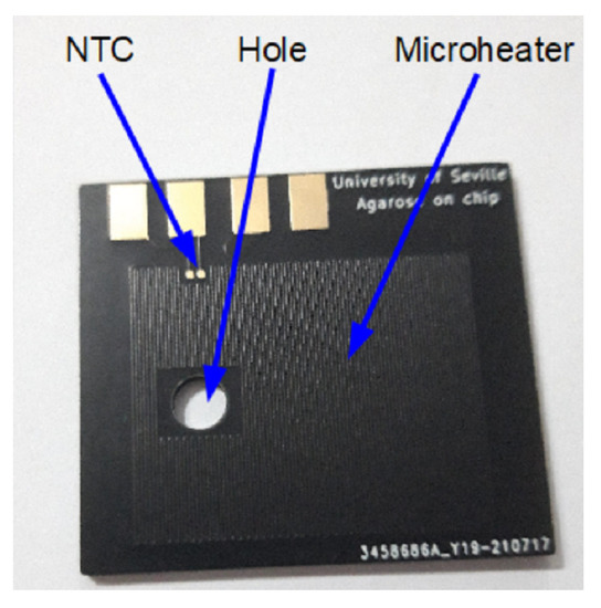 For example, the microheaters were used to prepare agarose gel using lab-on-PCB devices [32]. This microheater was fabricated using commercially available PCB substrates, as can be seen in Figure 2. The majority of microheaters are integrated with a thermal sensor to control the temperature set point. In the case of the Figure 2, the sensor is a negative temperature coefficient (NTC) resistor with a surface-mounted device (SMD) package. However, the proper microheater can be used as a temperature sensor [25,28].