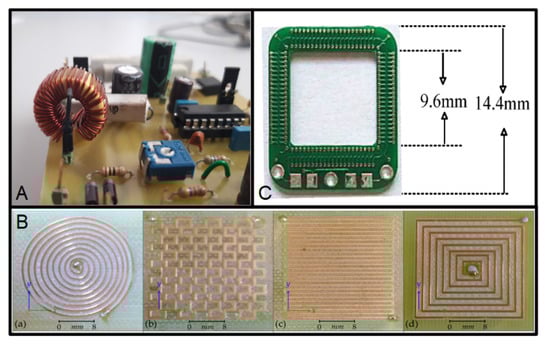 The coils are used for developing inductors [36]. The most common inductors are intended to be soldered in a PCB, as in Figure 3A. However, this kind of component can be integrated using the copper layers of a Printed Circuit Board.