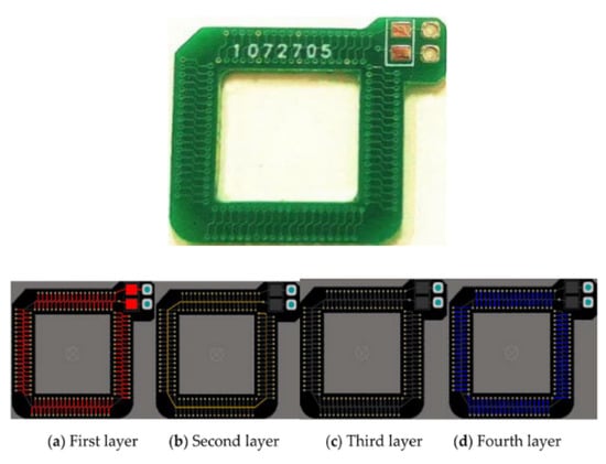A different and widely known coil structure is the Rogowski coils. These are electrical devices used to measure the AC current or high-speed current pulses. Typically, they are helicoidal-based metal lines, with a toroid configuration. The conductor cable is encircled by the toroid to measure the current. Many devices were developed using PCB substrates for power electronic applications as current sensors [48,49,50]. A PCB-base Rogowski coil can be seen in Figure 1C [38]. This kind of coil requires more than one copper layer; for example, the coil reported in [51] is fabricated using four layers, as in Figure 4. This last Rogowski coil is used as a sensor for press-pack insulated gate bipolar transistor chips.