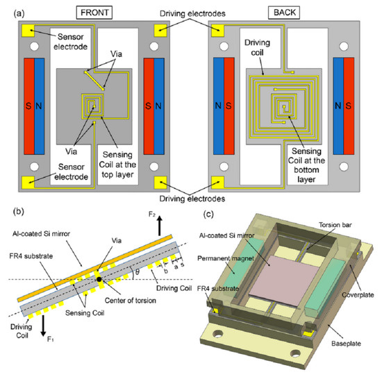 (a) Layout of the platform with double-layer copper coils; (b) electromagnetic actuation and sensing of the platform with the mirror plate; (c) schematic of the assembled scanning micromirror (reprinted from [126], copyright (2018), Creative Commons License).