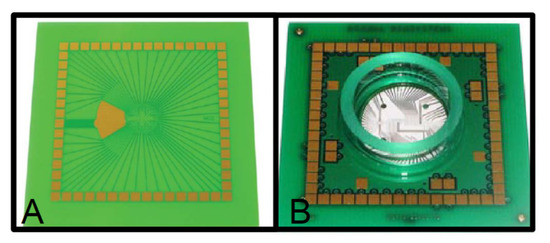 The use of PCB substrates for these applications is well-known and well-established. This has led the creation of many commercial companies, which offer a rapid and low-cost fabrication of PCBs with very good characteristics. These advantages, that is, their low cost and precise dimensions, together with the characteristics of the PCB, made this substrate an interesting material to perform applications for which the PCB was not intended. Regarding this, microelectromechanical systems (MEMS), which typically and historically used silicon as base material, adopted the Printed Circuit Board as an alternative material due to its advantage of having one or more copper layers to fabricate microchannels, sensors or actuators, and the ability to include microfluidics and electronics in the same substrate at a low cost [10,11,12,13,14,15]. These devices were named PCB-MEMS, and formed the origin of much more developments thanks to the application of lab-on-a-chip (LoC) devices.