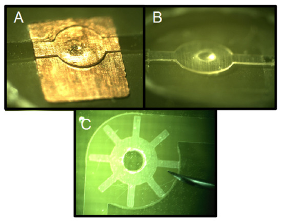The microvalves fabricated using PCBs require an additional material for the microfluidic circuit; for example, SU-8 or PMMA. The microvalves reported in [134,135,136] used a copper line as a fuse to develop a single-use and normally closed microvalve, Figure 12A. This device was fabricated using SU-8 as an additional material, and PCB as a substrate to fabricate both the microvalve and the electrical connection needed for activation. In contrast, a single-use and normally open microvalve was developed in Reference [137]. In this case, the closing was achieved thermally by the melting of a PMMA microchannel using an integrated microheater. PCB-based heaters have also been used for flow driving [134,135,136]. In all these cases, the microheater is a copper line, fabricated using the same procedure as the ones commented on Section 3.1. However, in this case, the function of the final device consists of activating the microvalve, that is, the microheater has a secondary function.