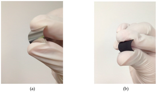 Photograph of 1.6 × 3.0 cm2 304 SS foil (a) before and (b) after CVD process.