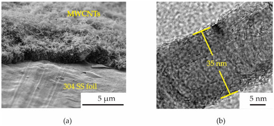 (a) SEM image of MWCNTs grown on 304 SS foil and (b) HRTEM image of synthesized MWCNT in this synthesis.
