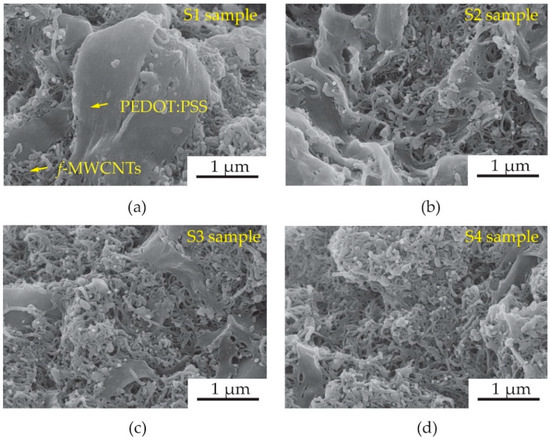 SEM images of f-MWCNTs embedded in PEDOT:PSS sensing-films at different samples of (a) S1, (b) S2, (c) S3 and (d) S4.
