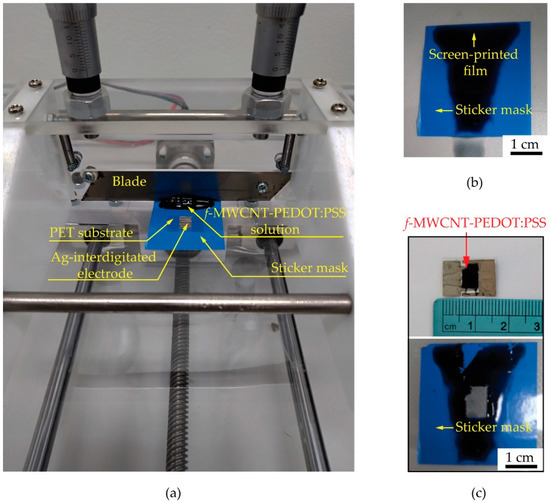 Photograph of (a) home-made doctor blade coater and its part. Screen-printed film of f-MWCNT-PEDOT:PSS gas sensor (b) before and (c) after peeling the sticker mask.