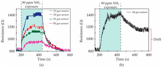 Resistance changes of (a) S0, S1, S2, S3 and (b) S4 gas sensors under 80 ppm NH3 exposure.