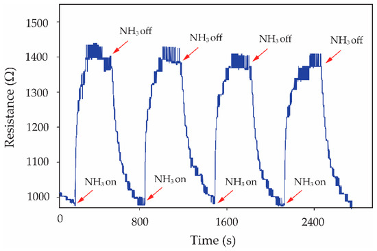 Resistance change of S3 gas sensor in handling repeated inlets of 80 ppm NH3 exposure.