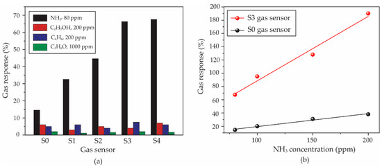 (a) Comparison of gas response for all sensors under different test gases. (b) Gas response of S0 and S3 gas sensors as a function of NH3 concentration.