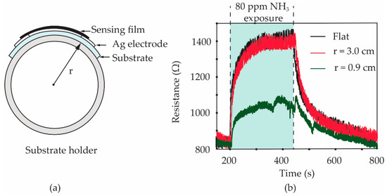 To study the effect of the bending state on the gas response of sensors, the S3 gas sensor was bent to a curvature radius of 3.0 and 0.9 cm, respectively. Furthermore, the sensor with a flat state was also tested as a comparison. Polylactic acid (PLA) filaments were printed in the cylindrical shape with an outer radius of 3.0 and 0.9 cm by a 3-dimensional (3D) printer. As shown in the diagram in Figure 11a, a PLA cylindrical shape was used as a holder for laying a fabricated sensor on its side surface. The sensor was carefully attached to a PLA holder using a Scotch® tape before it was inserted into a test chamber of the gas-sensing measurement system. It should be noted that only one sensor can be tested at a time. After testing the bending sensors, as shown in Figure 11b, the gas responses of the S3 sensor under flat and 3.0 cm bending-radius states did not present an obvious difference. The calculated values of the gas response for two of the sensors are found to be 67.5 and 65.0%, respectively. For the 0.9 cm bending-radius state of the sensor, it was observed that the calculated value of gas response significantly reduced to 29.5%. The reduction in the NH3 response for the sensor under heavy substrate-bending is further discussed based on a tensile strain effect.