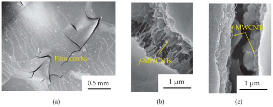 To understand the tensile strain effects on the gas response of the f-MWCNT-PEDOT:PSS gas sensor, the surface morphology of the S3 screen-printed film after already bending test was further investigated. Figure 12 shows the SEM images of f-MWCNTs embedded in PEDOT:PSS sensing films (S3 sample) after bending tests with 3.0 cm and 0.9 cm radii. It was observed in Figure 12a that there were some cracks in the bending-film surface. The sizes of the crack gaps for the films after 3.0 and 0.9 cm bending-radius tests were found to be ~1.1 and ~1.5 μm, respectively. After a test of 3.0 cm bending-radius (Figure 12b), there were f-MWCNT alignments in the film, which acted as conductive pathways between the gap. For the much larger crack gap of a 0.9 cm bending-radius film (Figure 12c), a lack of f-MWCNT pathways was observed. Delamination, channeling and cracking have been reported as important causes for the failure of breakable films on flexible substrates [23,24,25]. When decreasing the stress on the film surface, the tensile strain increased. Therefore, the crack paths on the film surface were generated. This is the most common observation for the polymer film during the bending process. Figure 13 shows the schematic diagram of pathways in electron transports for a f-MWCNT-PEDOT:PSS gas sensor under a flat state (Figure 13a), 3.0 cm (Figure 13b) and 0.9 cm (Figure 13c) bending-radius states. The reduction in the NH3 response for the sensor under heavy bending has been also discussed, in that the cracks generate permanent changes in the electrical resistance of PEDOT:PSS sensing films. However, the f-MWCNTs embedded in the PEDOT:PSS act as additional pathways in electron transport. Therefore, the changes in electrical resistance of the f-MWCNT-PEDOT:PSS sensing film with weak bending have little impact on the electrical property and gas-sensing performance. This may provide a reason as to why the gas response of the f-MWCNT-PEDOT:PSS gas sensor under flat and 3.0 cm curvature-radius states did not lead to an obvious difference. However, due to the large crack gap in the heavy bending substrate, the sensor under 0.9 cm bending radius presents a low response to 80 ppm NH3. This is due to the lack of f-MWCNT connectors between the gap. This results in the creation of low conductive pathways in electron transports. Therefore, low signals of gas response for the f-MWCNT-PEDOT:PSS gas sensor to NH3 under heavy substrate-bending are represented.