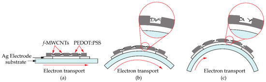 Schematic diagram of pathways in electron transports for f-MWCNT-PEDOT:PSS gas sensor (S3 sample) under (a) flat state, (b) 3.0 cm and (c) 0.9 cm bending-radius state.