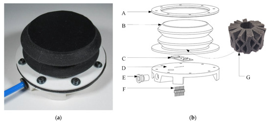 The soft robotics module. (a) The module; (b) exploded view of the module with A—ring, B—bellow, C—sensors breakout, D—base plate, E—pneumatic fitting, F—male header, and G—Octaspring.
