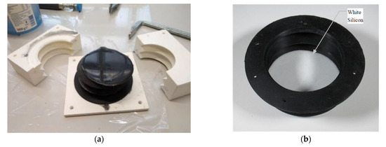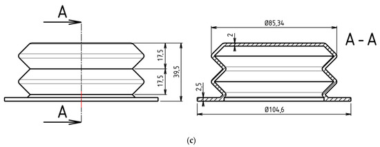 Manufacturing process of the module (left: casting, right: part of the inside surface). (a) Mold, (b) white inside, and (c) dimensions of the bellow (in mm).