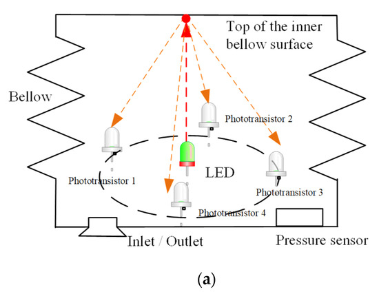Figure 3a illustrates the principles of the embedded sensor of the module. At the bottom of the bellow, an inlet/outlet is connected to the pneumatic pump for inflation/deflation of the module. The pressure inside the bellow is measured by a pressure sensor. At the center of the bottom of the bellow, an LED is installed. The light it emits is directed toward the top of the inner surface of the bellow as the red arrow in the figure. As the top inner surface is made of white silicone and the surface finishing is matte, the reflection of a red LED light is a diffused reflection, i.e., the ray incident on the surface is scattered at many angles as the orange arrows in the figure. Four phototransistors, which are positioned around a virtual circle (7 mm radius) of the LED, capture the reflecting lights. In general, the shorter the distance between the LED and the top inner surface is, the higher the intensity of the reflecting light is.