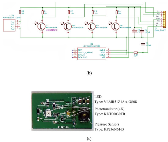 Following the principles, the schematic of the sensor breakout is designed as Figure 3b. The breakout is presented in Figure 3c. In the breakout, a red LED (type: VLMR51Z1AA-GS08, Vishay Semiconductors, Malvern, PA, USA) is selected. In the design of the assembly of the breakout and the bottom plate of the module, the position of the LED is aligned to the center of the bottom of the bellow. Around the LED, four phototransistors (type: KDT00030TR, Onsemi, Phoenix, AZ, USA) are installed, and the absolute air pressure sensor (type: KP236N6165, Infineon, Munich, Germany) is located at the right of the breakout.