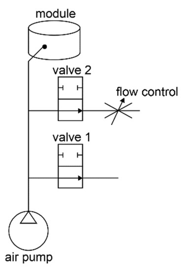 One pump and two valves, connected to an electrical power supply and controlled by an Arduino compatible embedded system, are used for actuating each module and maintaining a certain bellow shape, as shown in Figure 4. In the system, valve 1 is open to the atmosphere. Valve 2 had flow control, meaning that if it was open, the air could only escape slowly. Together with the pneumatic pump with varying flow (using pulse width modulation), the system can perform the following actions: