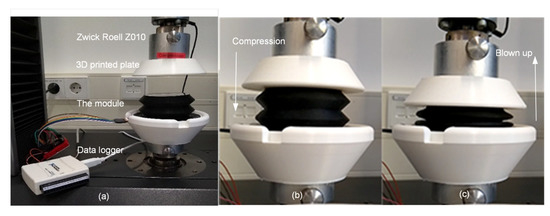 Data collection for the module: (a): the setup; (b): compression; and (c): blown up.