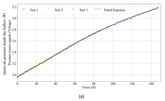 In the first experiment, we investigated the relation between the pressure and the force via Action Inflation. We gradually inflated the bellow three times with 50, 100, and 150 N as maximal loads, respectively. The range of the inflation was controlled in such a way that the Octaspring and the inner top surface were always in contact as the right-most picture in Figure 6. Figure 7a presents the relations between the pressure and the force, and high coherence can be found regarding the output of the three experiments. Based on Figure 7a, we modelled the relations between and by polynomial regression as: