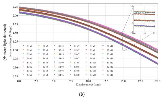 Figure 7b presents the relations among displacement and the collected sensor signals (voltages from the readout circuit of the four phototransistors). It can be found that (1) although the phototransistors are distributed around the LED, the signals collected from them are not in the sample amplitude, mainly due to the noise and deviations in the manufacturing and assembly; (2) the relation between the displacement and the amplitude of the signal is not influenced by the speed. To model the relations, we introduced a simple artificial neural network (ANN) with an input layer of four neurons, i.e., the four sensor signals , a hidden layer of 10 neurons and an output layer of one neuron, i.e., the displacement . Five-fold cross-validation indicates that by using the proposed network, it is able to predict the displacement with a mean absolute error (MAE) of 0.26 mm. Therefore, relations between displacement and the sensor signals can be described as: