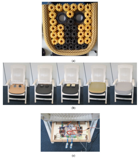 The design was built on a 520 mm × 520 mm seat cushion from the manufacturer Octaspring (Figure 8a). Pynt et al. [15] explain that in the sitting position, the sitting bones (ischial tuberosities) support most of the body weight. Therefore, two modules were placed in the area where the sitting bones were expected. The cushion with integrated modules is placed on a garden chair to simulate a simplified car seat (Figure 8b). The seat has a backrest angle of 110 degrees and the seat pan 15 degrees, comparable with many automotive seats [2].