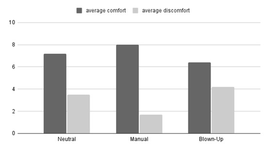 In Figure 9, the average comfort and discomfort ratings during neutral, self-chosen, and blown-up mode are presented. During the pulsating mode, it was found that the subjects had difficulties giving a (dis)comfort rating since the mode was dynamic. For this reason, the (dis)comfort ratings of pulsating mode are not included in the figure.