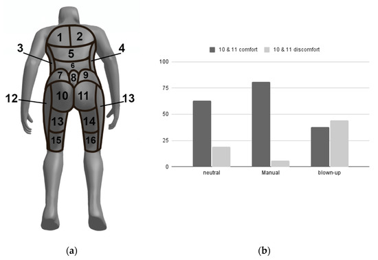 (Dis)comfort areas. (a) Body map for indicating the area of (dis)comfort. (b) Percentage of most (dis)comfort scores in the buttock area.