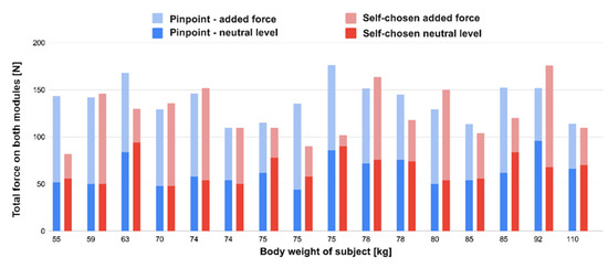 - Self-chosen mode, which allows the subject to regulate the pressure added by the modules (0–75 N) by turning a knob. The subject is asked to find the most comfortable position by experimenting with pressure control. The added force at that moment and the neutral force are documented by the researcher.