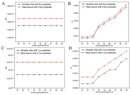 To match the dimensionless flow parameters, the spherical silver particles (density ) with a diameter of and were chosen to represent the inhaled particles (density ) with a diameter of and in the case of the real human respiratory process, respectively. The dimensionless numbers of particles in the alveolar chip and in the human alveoli were calculated and compared, as shown in Figure 2. The relative differences in the Stk and H of particles in the alveolar chip between the present model and real acinus at different generations were all within 20%, which is acceptable considering so many dimensionless parameters were being matched at the same time.