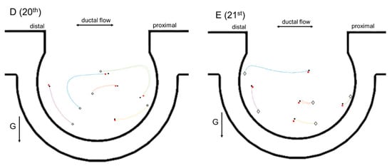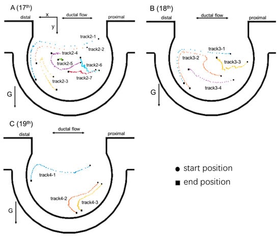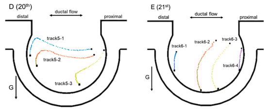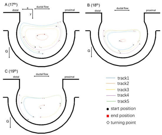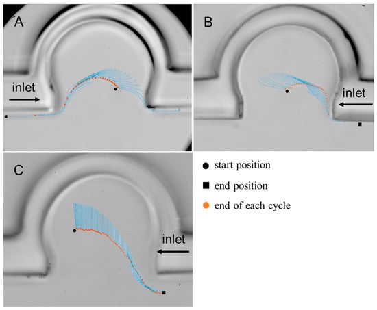 Figure 3 shows trajectories of particles with different sizes at the 21st and 23rd acinar generation in the horizontally placed chip. The high-speed camera with a frame rate of 25 fps was applied to take photos of silver particle positions for a sufficient number of breathing cycles in the experiment. Then, we determined these silver particle positions from image analysis and plotted the real particle trajectories. We tracked the particles for a long time, so the particle trajectories displayed on the finite-size graph are visually overlapping. The blue lines represent the particle trajectories. The black dots represent the particle start positions and the black squares represent the particle end positions. The orange dots are the particle positions at end of each breathing cycle. There was a vortex and a radial flow coexisting at the 21st acinar generation, and there was only radial flow at the 23rd acinar generation [27,28]. The start positions of particles were all inside the single alveolus. As the human breathing cycles increased to a certain number, the particles finally escaped from the alveoli and entered the alveolar duct. In one breathing cycle, the trajectories of particles in the exhalation were similar to that in the inhalation, but they did not overlap exactly, reflecting the irreversibility of particle trajectories. The particle positions were very close to the original positions after one breathing cycle. It was found that particles in the alveoli either escaped from the inlet side of the alveolar duct or stayed in the alveoli after sufficient breathing cycles. The behavior was independent of the direction of the inlet and the size of particles (Figure 3B,C). This phenomenon revealed that particle transport in alveoli is irreversible.