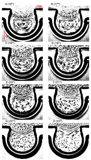 The alveolar flow patterns at different acinar generations in vertically placed single alveolar chip were measured by superimposing eight subsequent single snapshots, as shown in Figure 4. The ductal inlet was on the right of the alveolus, and the gravitational direction was opposite to the direction of the alveolar opening. There were two main kinds of alveolar flow fields, vortex and radial flows. As the acinar generation number increased, the vortex of the alveolar flow was gradually squeezed to the proximal alveolar wall from the alveolar center. The 22nd generation was the last generation where the vortex and radial flows coexisted (Figure 4G), which was different from the alveolar flow patterns with the horizontally placed chip [28]. Only at the 23rd acinar generation did the vortex flow completely disappear (Figure 4H). Gravity had a weak influence on the alveolar flow pattern and it enhanced the influence of the vortex flow at the last several acinar generations.