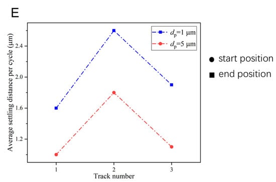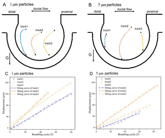 The particle size had an important influence on the settling rate in the alveoli. The settling process of particles of two sizes in the alveoli was investigated in this paper. Figure 7 shows a comparison of the settling rates of silver particles with diameters of and in the vertically placed alveolar chip at the 21st acinar generation. The reason for selecting the 21st generation to study the size effect on particle sedimentation was that the particles start to directly settle to the bottom from the 21st generation, as shown in Figure 6, and we wanted to work out what different phenomena could be observed for particles of different sizes. Figure 7A,B show the end positions of each breathing cycle of the particles in the middle and on both sides of the alveolus. Colors have no significance other than to differentiate between individual particles, and the particle start positions were all at the alveolar opening. The trajectories of particles with a diameter of had a greater degree of curvature in the middle of the alveoli than that of particles, and it revealed that the drag force had a greater effect on the movement of particles compared to particles. All the particles would eventually deposit on the bottom of the alveolus. Figure 7C,D show the settling distance along the gravitational direction over the breathing cycle of the particles in Figure 7A,B, respectively. The particle displacements all increased linearly with the breathing cycles. The fitting degrees of track 1–3 in Figure 7C were 0.996, 0.997,0.989, respectively, and the fitting degrees of track 1–3 in Figure 7D were 0.949, 0.999,0.998, respectively. The slopes of these linear fits were used as average settling distances per breathing cycle of corresponding particles, as shown in Figure 7E. Particles (track 2) in the middle of the alveolus settled faster than those (track 1 and track 3) on either side at the same generation. In addition, the smaller particles settled faster than the larger ones in the same area at the 21st acinar generation. The particle transport and sedimentation in the alveoli was mainly affected by the drag force. The drag force played a leading role in particle transport and sedimentation in the alveoli, and the trajectories of particle positions at end of each breathing cycle were similar to the streamlines.