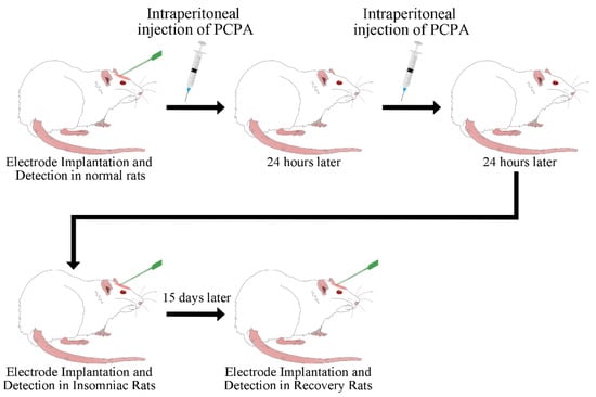 The schematic procedure of the experiment is shown in Figure 1. Twelve adult male Sprague Dawley (SD) rats weighing 250 g were randomly assigned to 3 groups: 4 rats were used as the control group, 4 rats were induced to become insomnia rats, and 4 recovered rats were detected 14 days after modeling. The laboratory temperature was kept at 25 °C to avoid the effects of low ambient temperatures [].
