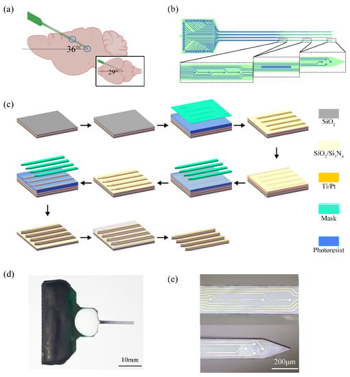 MEA design and fabrication. (a) MEA implantation path diagram in the sagittal plane. The blue circles are the location of the hippocampus and dorsal raphe nucleus. The smaller picture shows the MEA implantation path in the horizontal plane; (b) Site distribution map of the MEA; (c) The fabrication processes of the MEA. The processes are SOI wafer, thermal oxidation, photolithography, sputtering and stripping, plasma chemical vapor deposition, photolithography, oxygen plasma etching, photolithography, deep etching, black glue coating, and electrode release; (d) MEA finished product drawing, and (e) optical image of the MEA site. The upper image shows the site of the hippocampus, and the lower image shows the site of the dorsal raphe nucleus.