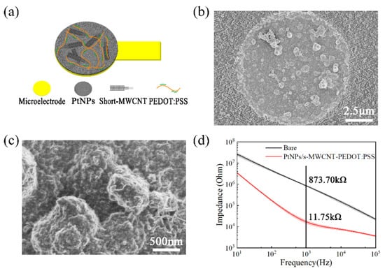 The naked sites are shown in Figure 2e. The purpose of surface modification of MEA sites was to increase the site’s surface area. In addition, for the same tube diameter, the shorter the tube length, the larger the specific surface area of the multi-walled carbon nanotubes []. Therefore, we adopted PtNPs/short MWCNT-PEDOT: PSS as the modification scheme for this study. A three-electrode setup was used in this experiment (MEA: working electrode; Pt: counter electrode; Ag|AgCl: reference electrode). First, platinum nanoparticles (PtNPs) were electrodeposited onto sites by chronoamperometry (CA, −1.0 V, 40 s) in a mixed solution of 48 mM chloroplatinic acid and 4.2 mM lead acetate. Then, the electrodeposition of short-MWCNT-PEDOT: PSS was performed by cyclic voltammetry sweeping (0–0.9 V) for 10 cycles in the mixture solution of PSS (0.2 M), EDOT (40 mM), and short-MWCNTs (4 mg/mL).