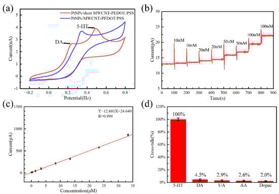 The cyclic voltammetry of the MEA sites modified with PtNPs/MWCNT-PEDOT: PSS or PtNPs/short MWCNT-PEDOT: PSS is shown in Figure 4a. The redox curve of the MEA site modified with PtNPs/MWCNT-PEDOT: PSS had only one oxidation peak (0.350 V), which cannot distinguish DA and 5-HT in solution. The redox curve of the PtNPs/short MWCNT-PEDOT: PSS-modified MEA site has two oxidation peaks, which can clearly distinguish DA (0.250 V) and 5-HT (0.495 V) in the solution. When a 50 nM solution of 5-HT was dropped in the PBS, the current changed significantly (signal-to-noise ratio > 3), so the minimum detection limit of 5-HT for this MEA was 50 nM (Figure 4b). In addition, the 5-HT solution at a concentration of 10 nM–10 uM was sequentially dropped into the PBS solution. When the linear range was 10 nM–35 μM, the sensitivity of MEA was 12.601 pA/μM (R = 0.999) (Figure 4c). Finally, MEA has excellent selectivity (Figure 4d). The selectivity ratios of MEA to DOPAC, Glu, UA and AA were 95.5, 97.1, 97.5 and 98.0%, respectively.