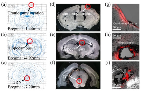 MEA implantation path verification. (a) Craniotomy location in the brain atlas; (b) Hippocampus in the brain atlas; (c) DRN in the brain atlas; (d) Craniotomy location in the brain slices; (e) Hippocampus in the brain slices; (f) DRN in the brain slices; (g) DiI traces at the craniotomy location by fluorescence microscopy; (h) DiI traces at the hippocampus by fluorescence microscopy; and (i) DiI traces in the DRN by fluorescence microscopy. (a–i) correspond with the coronal plane.