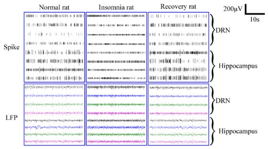 MEA captured the electrophysiological signals of normal, insomnia, and recovery rats, and spikes of over eight channels and were successfully recorded at a signal-to-noise ratio of above 3.5 (Figure 6). The MEA sites were in close contact with neurons in brain regions, so the information displayed by each channel clearly reflected neural information in the hippocampus and DRN. The real-time neural spikes and local field potentials (LFPs) were recorded simultaneously in eight different channels over a 30 s period. As seen in Figure 6, spikes in both brain regions of normal rats fired at a relatively slow rate. Significantly, spike discharges in insomniac rats increased and became fiercer, accompanied by a frequent fluctuation of LFP.
