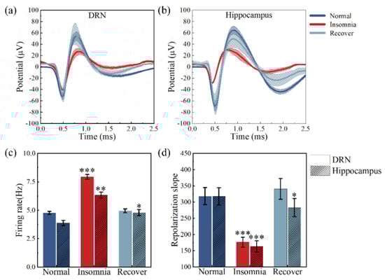 Statistics for spike waveform and firing rate of the rats’ dorsal raphe nucleus (DRN) and hippocampus in normal, insomnia and recovery states (n = 12). (a) Spike waveform statistics in the DRN; (b) Spike waveform statistics in the hippocampus; (c) Statistics for neural firing rate in the DRN and hippocampus; (d) Repolarization slope of spikes in the DRN and hippocampus. (* p < 0.05, ** p < 0.01, *** p < 0.001, compared to normal in the same brain region).